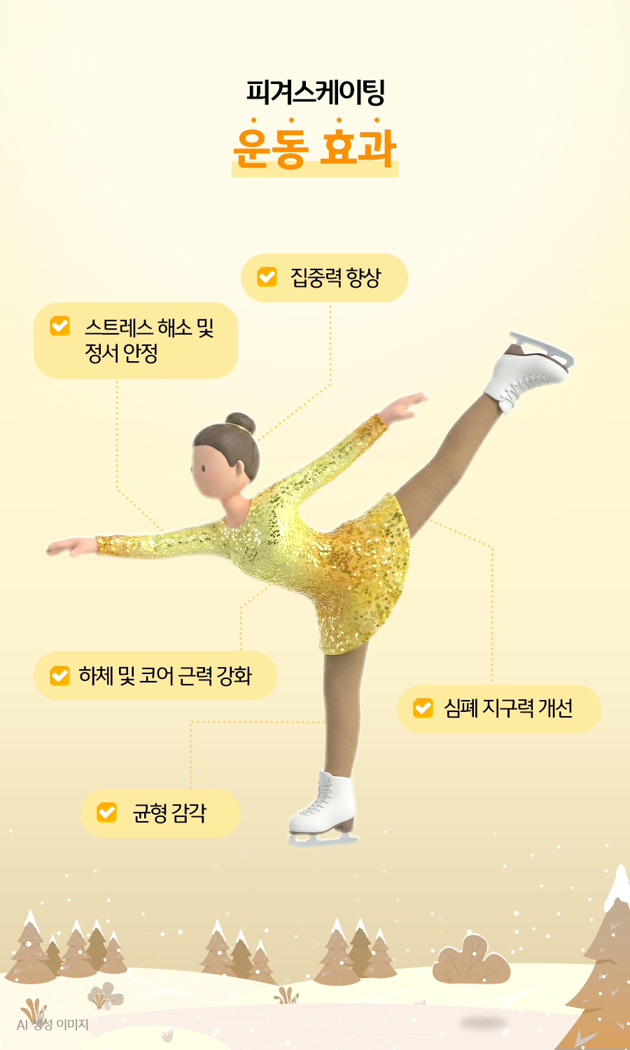 또한 한 발로 중심을 유지하고 방향을 전환하는 동작을 반복하며 균형 감각이 좋아지고, 동작을 익히는 과정을 통해 집중력도 향상됩니다. 더불어 피겨는 링크를 몇 바퀴만 돌아도 숨이 차오를 만큼 운동 강도가 있어서 심폐 지구력 개선에도 도움이 되는데요. 음악에 맞춰 몸을 움직이며 스트레스도 해소할 수 있는 운동입니다.