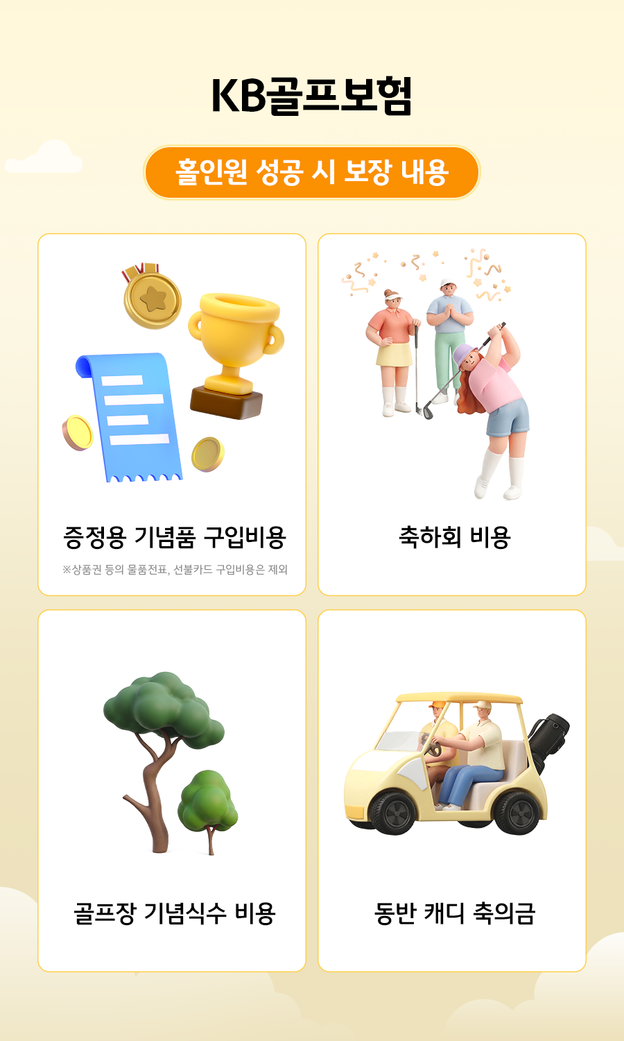 이러한 부담을 줄이기 위해 활용할 수 있는 것이 바로 골프보험입니다. 골프보험은 회사마다 보장 항목과 내용은 달라질 수 있는데요. KB골프보험 홀인원비용 특약은 아마추어로 경기에 참여한 피보험자가 홀인원을 성공할 경우 보험기간 중 1회에 한하여 가입금액 한도 내에서 관련 비용을 보상해 줍니다. 주요 보장 항목은 증정용 기념품 구입비용, 축하회 비용, 골프장 기념식수 비용, 동반 캐디 축의금이 해당합니다.