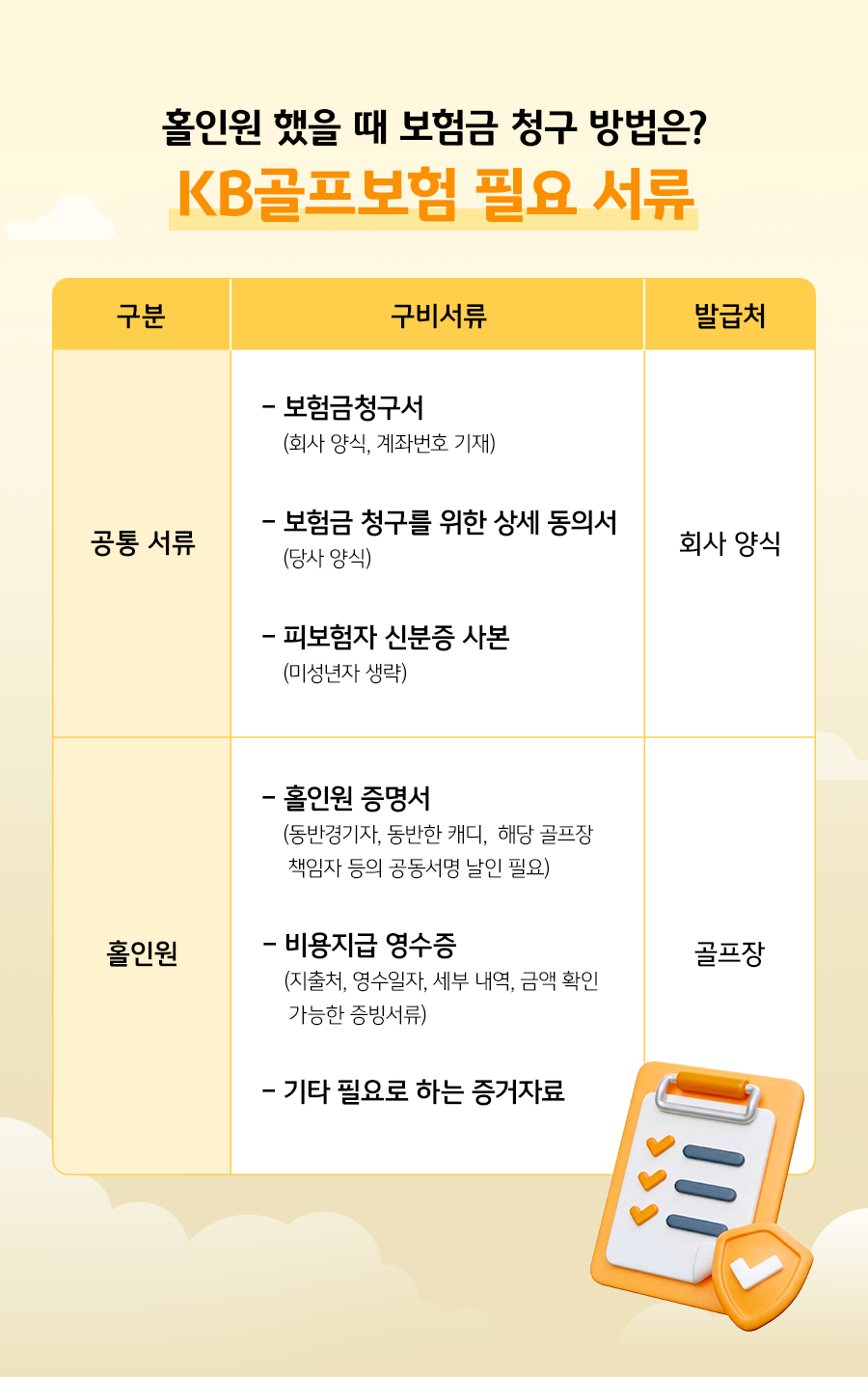그렇다면 홀인원을 했을 때 어떻게 보험금을 청구해야 할까요? KB골프보험의 경우 홀인원 보험금 청구를 위해서는 아래와 같은 서류가 필요합니다.