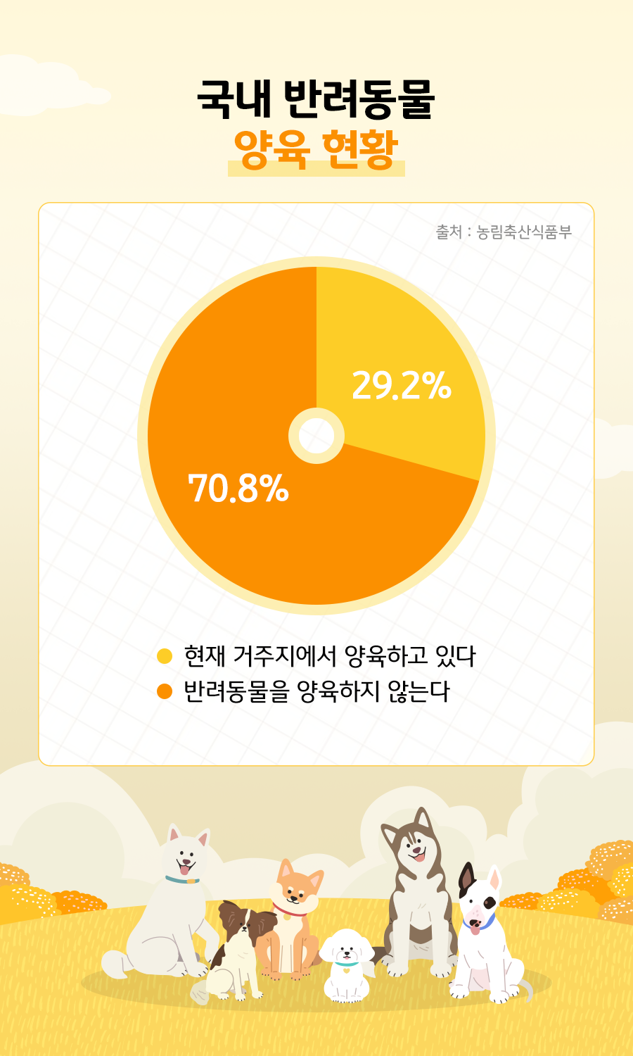 국내 반려동물 양육 가구 비율은 약 29.2%로 세 가구 중 한 가구가 반려동물을 키우고 있습니다.