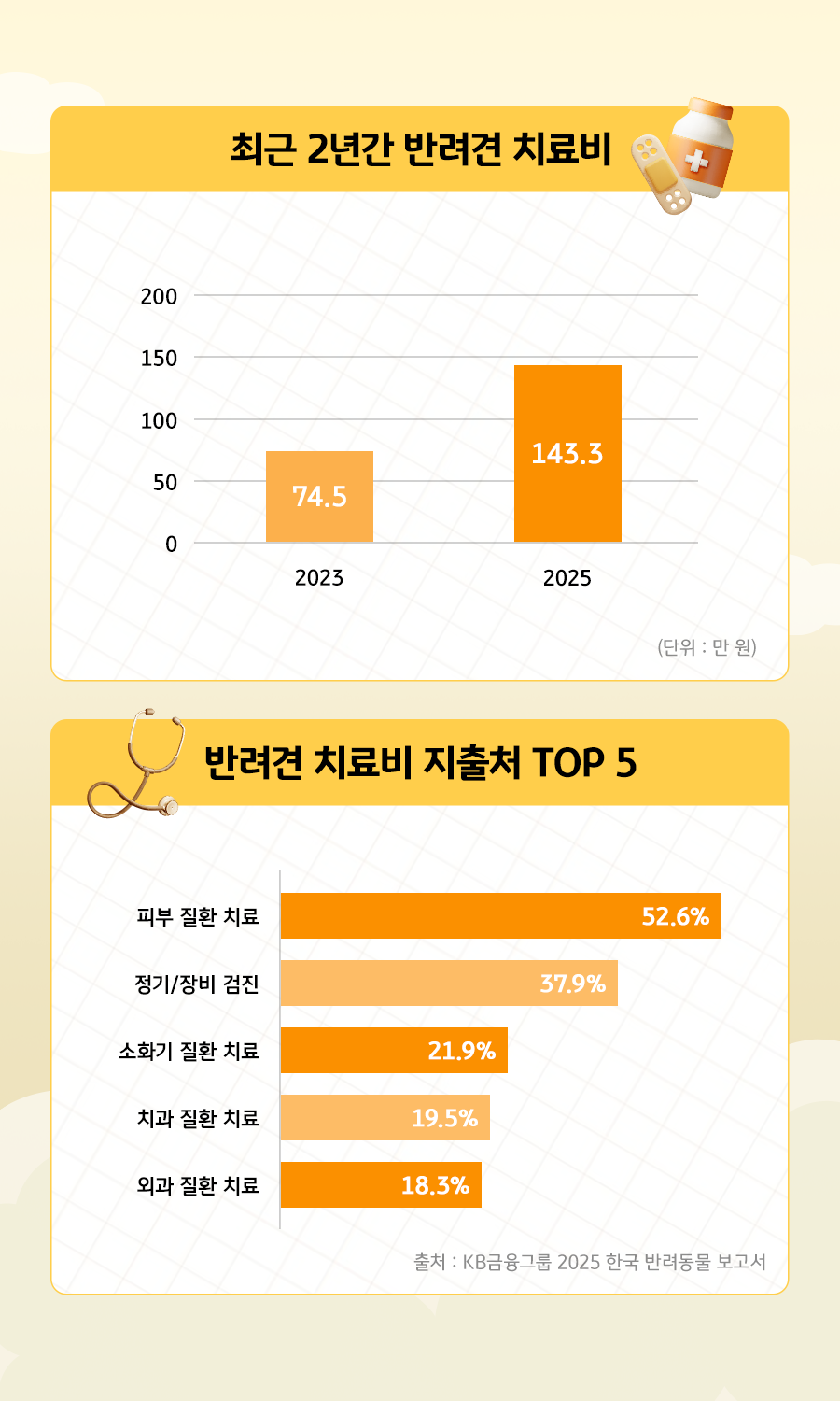 반려동물을 위해 반려가구가 지출하는 비용도 증가하고 있는데요. 그중에서도 규모가 가장 큰 지출 항목은 치료비입니다. KB금융그룹 「2025 한국 반려동물 보고서」에 따르면 최근 2년간 반려가구의 반려동물 치료비는 평균 102만 7천 원으로 2023년(57만 7천 원)에 비해 약 2배 늘어났고, 반려견 한 마리당 치료비는 143만 3천 원으로 2023년(74만 5천 원)에 비해 68만 8천 원이 증가했습니다.