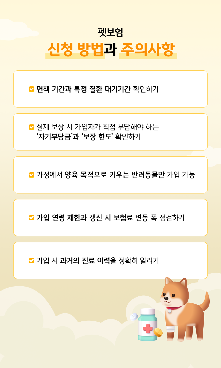 펫보험 가입 전후로 반려동물의 양육 목적, 질병, 복용 의약품, 거주지 등에 대해 보험회사에 알려야 합니다. 그렇지 않을 경우 추후 계약이 해지되거나 보장이 제한될 수 있습니다.