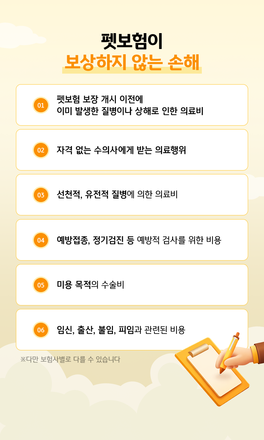 펫보험이 보상하지 않는 손해는 아래와 같고, 보험 상품별로 다를 수 있습니다.