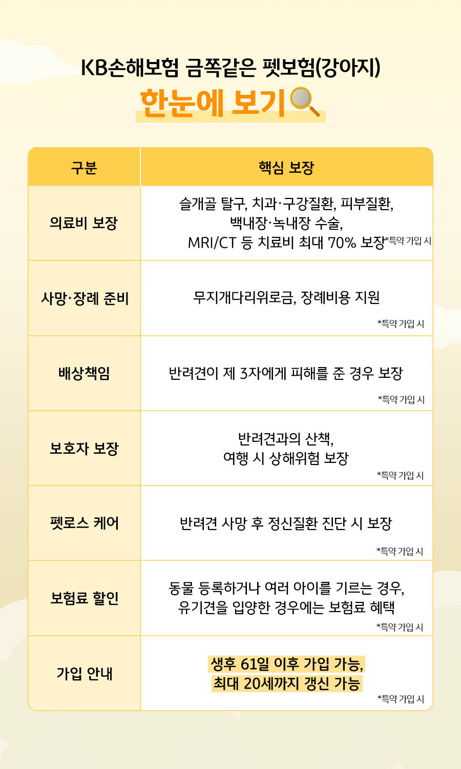 *만 0세인 반려동물은 생후 61일 이후부터 가입 가능, 최대 20세까지 갱신 가능