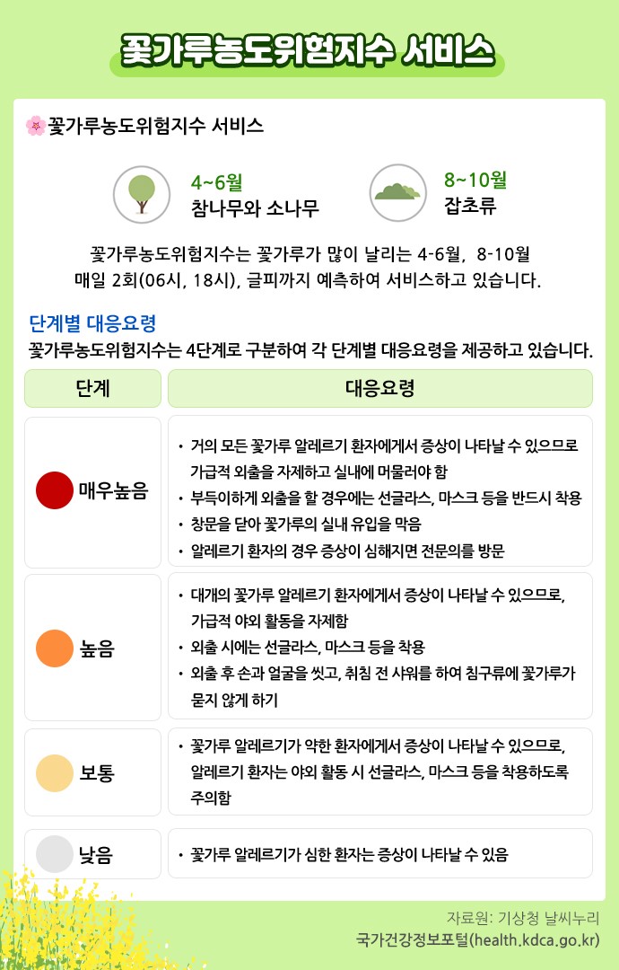 기상청 날씨누리에서는 꽃가루농도위험지수를 지역별로 4단계로 분류하여 단계별 대응요령을 안내합니다. 꽃가루농도위험지수는 기온, 풍속, 습도 등의 기상 조건을 분석하여 꽃가루농도를 예측하고,
