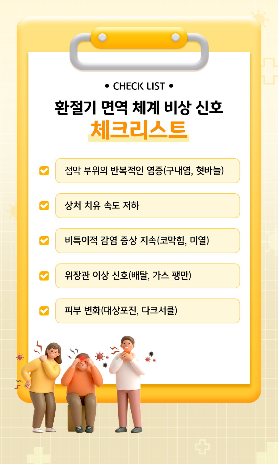 환절기에는 우리 몸도 다양한 방식으로 이상 신호를 보내기 시작합니다. 단순히 피곤한 수준을 넘어 아래와 같은 증상들이 나타난다면, 면역력이 약해졌을 가능성이 높습니다.